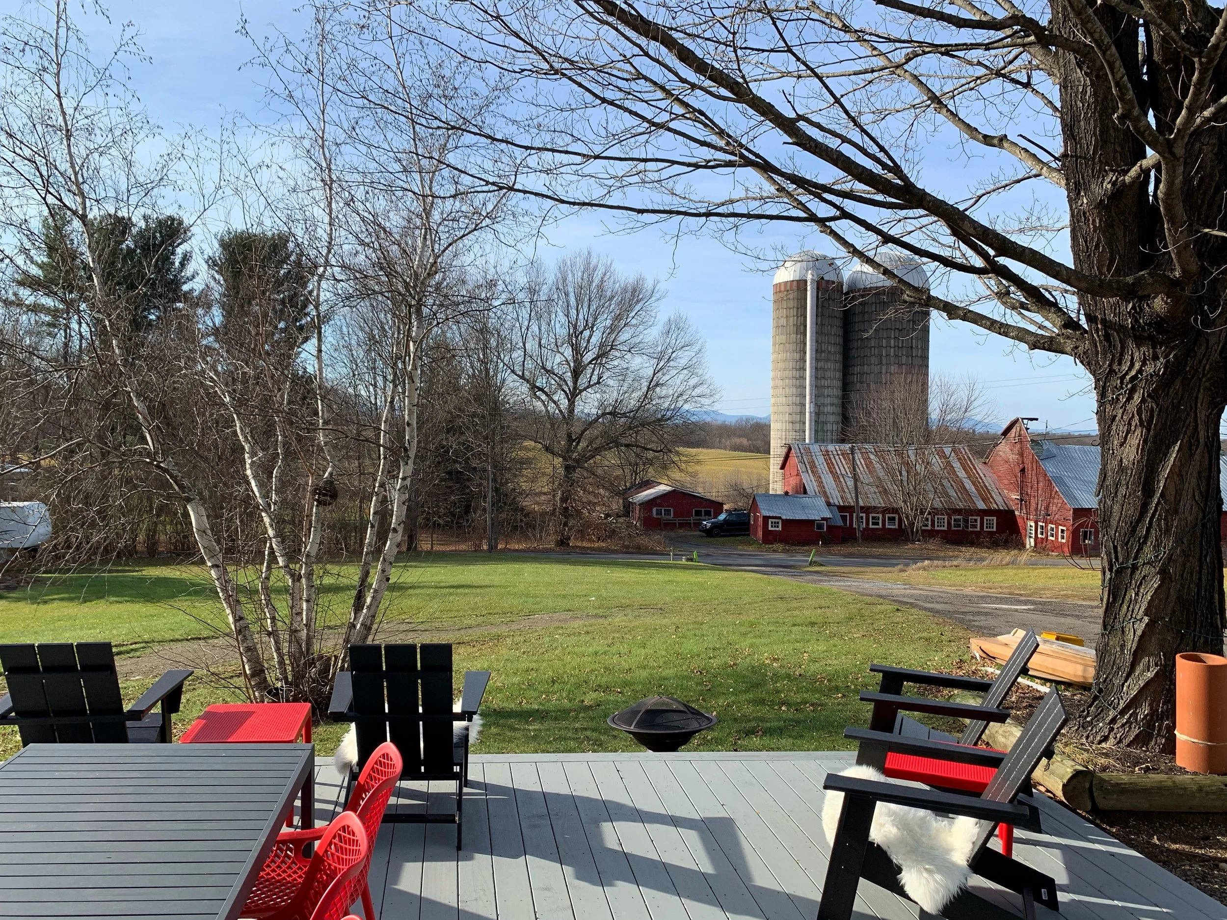 Outdoor deck with Adirondack chairs and mountain view