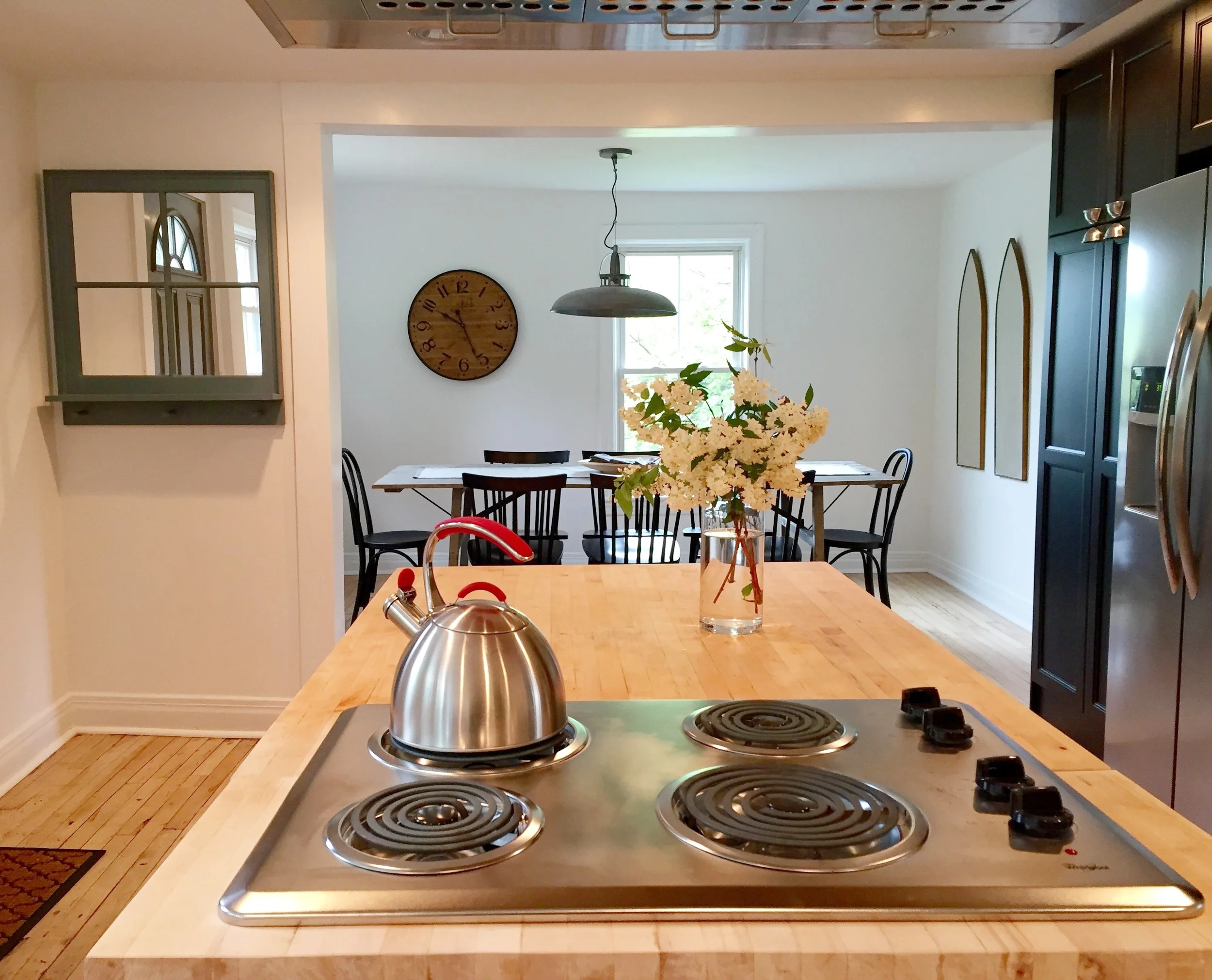 Dining room with farm table that seats 10